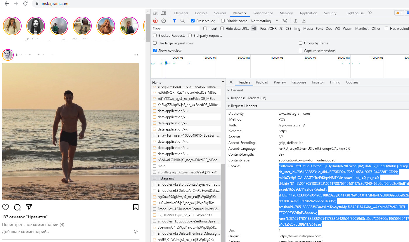 4. В списке выбрать "instagram/" или "bulk-route-definitions/" или "graphql/" , затем вкладки Headers -> Request headers -> Cookie